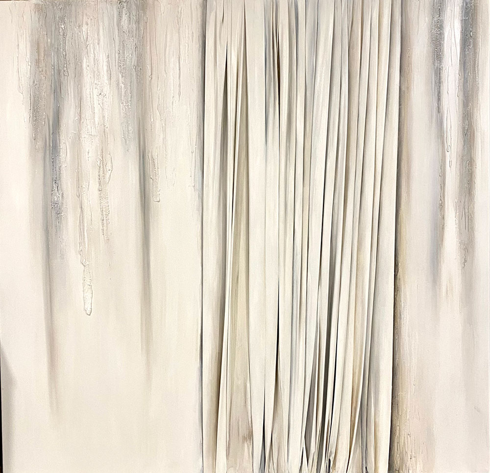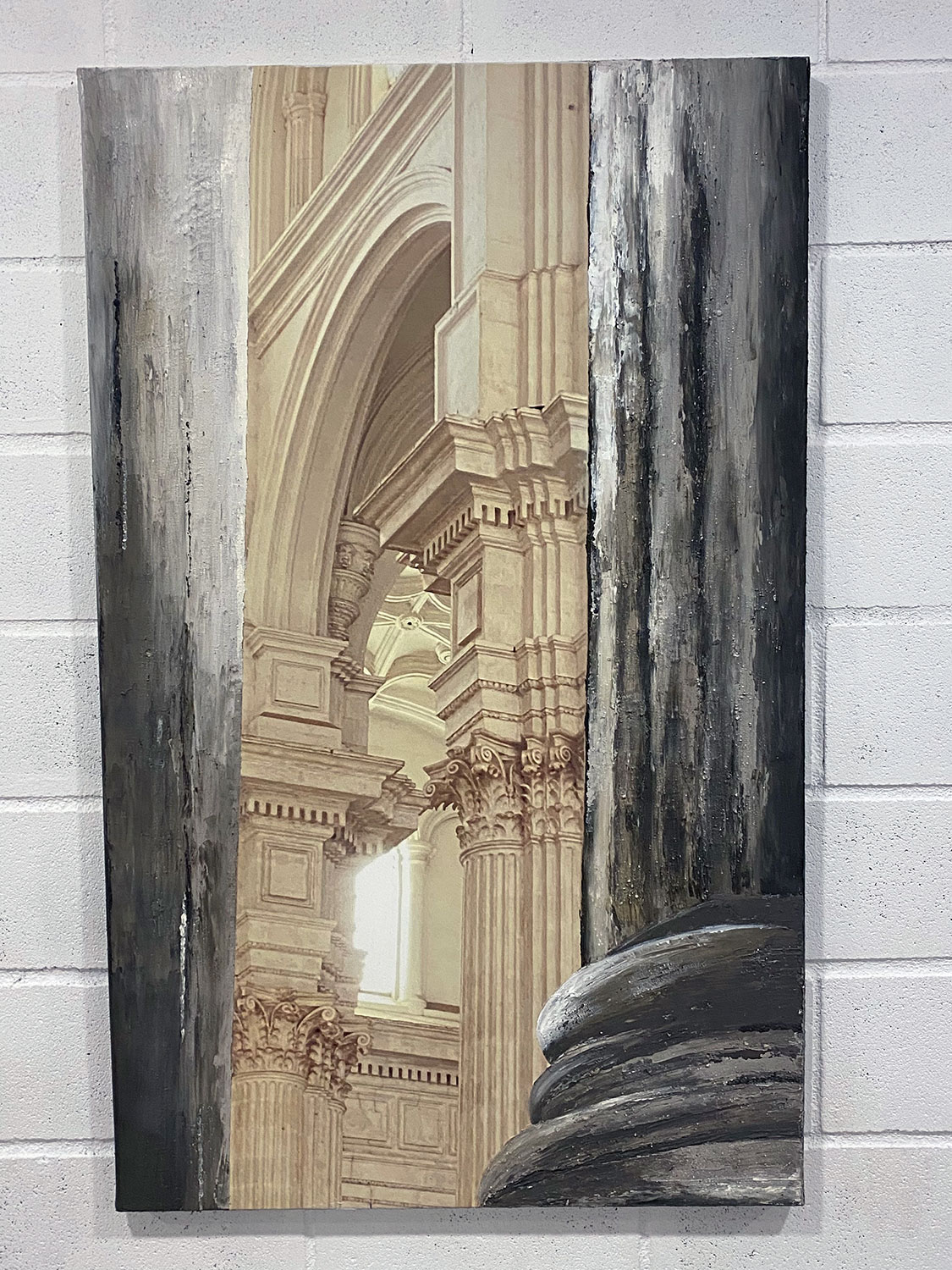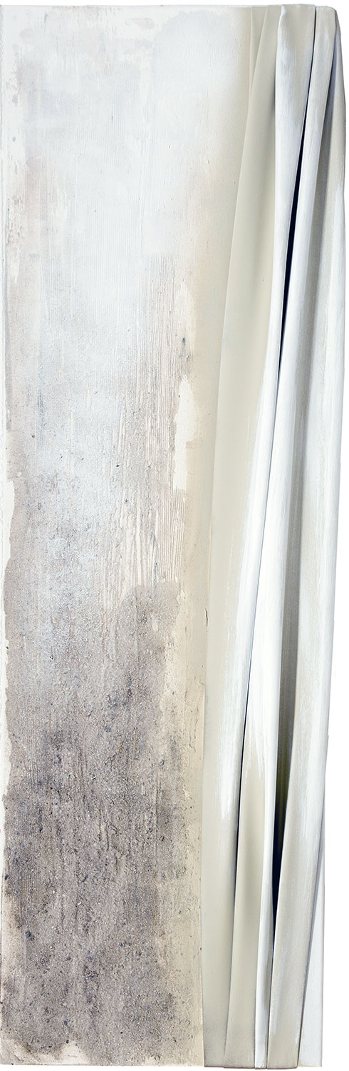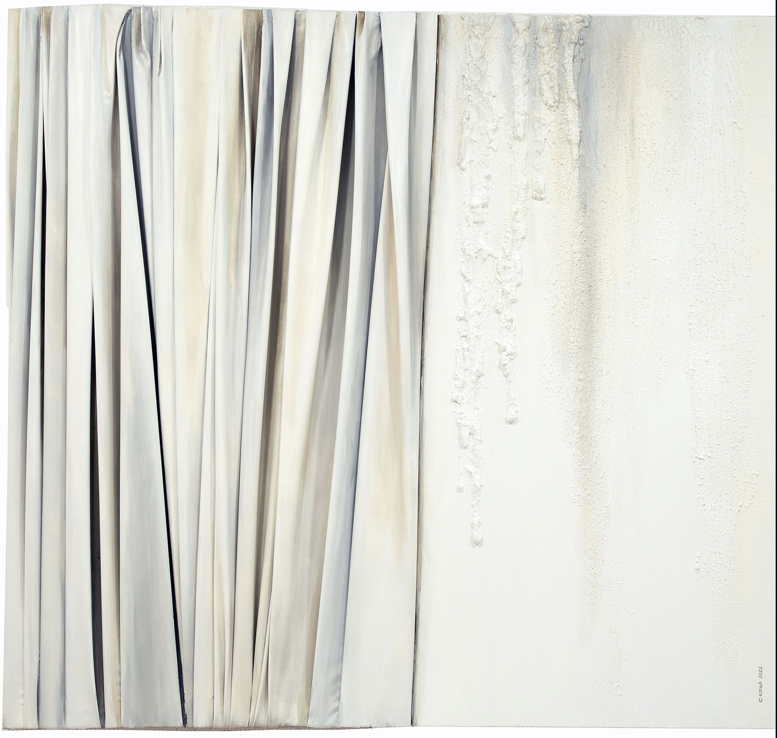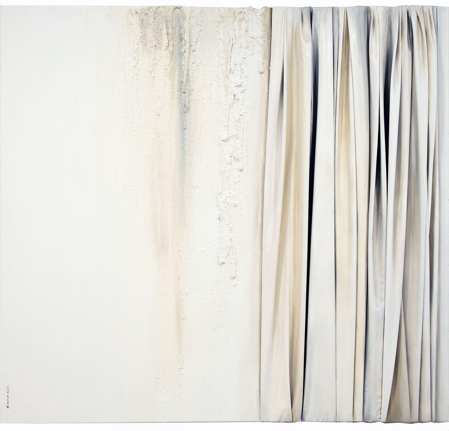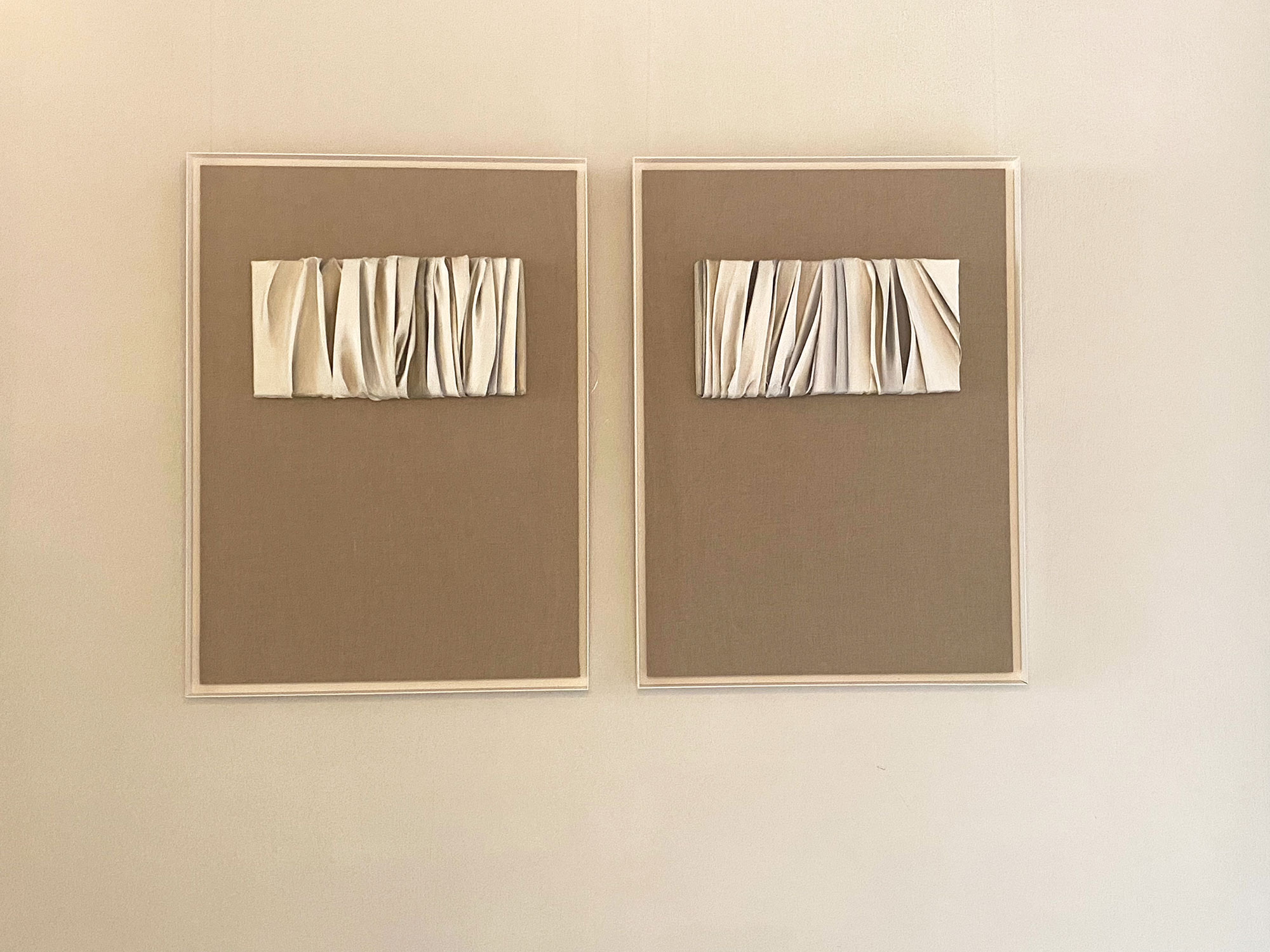 De naturaleza arquitectónica, tejido esculpido sobre tabla o lienzo, pliegues, volúmenes, profundidad, luces y sombras, recrean, arcos, capiteles, columnas y piedra.