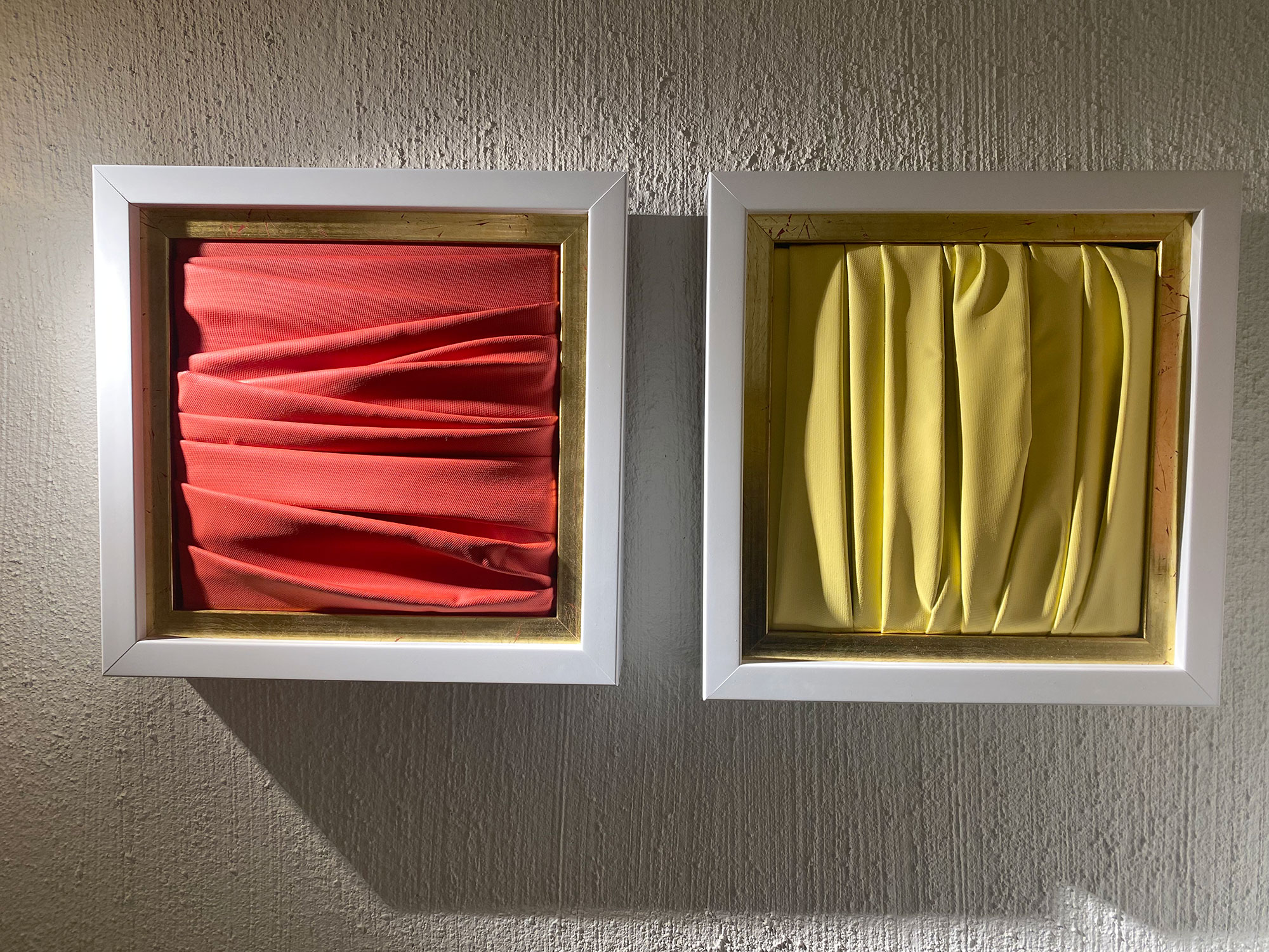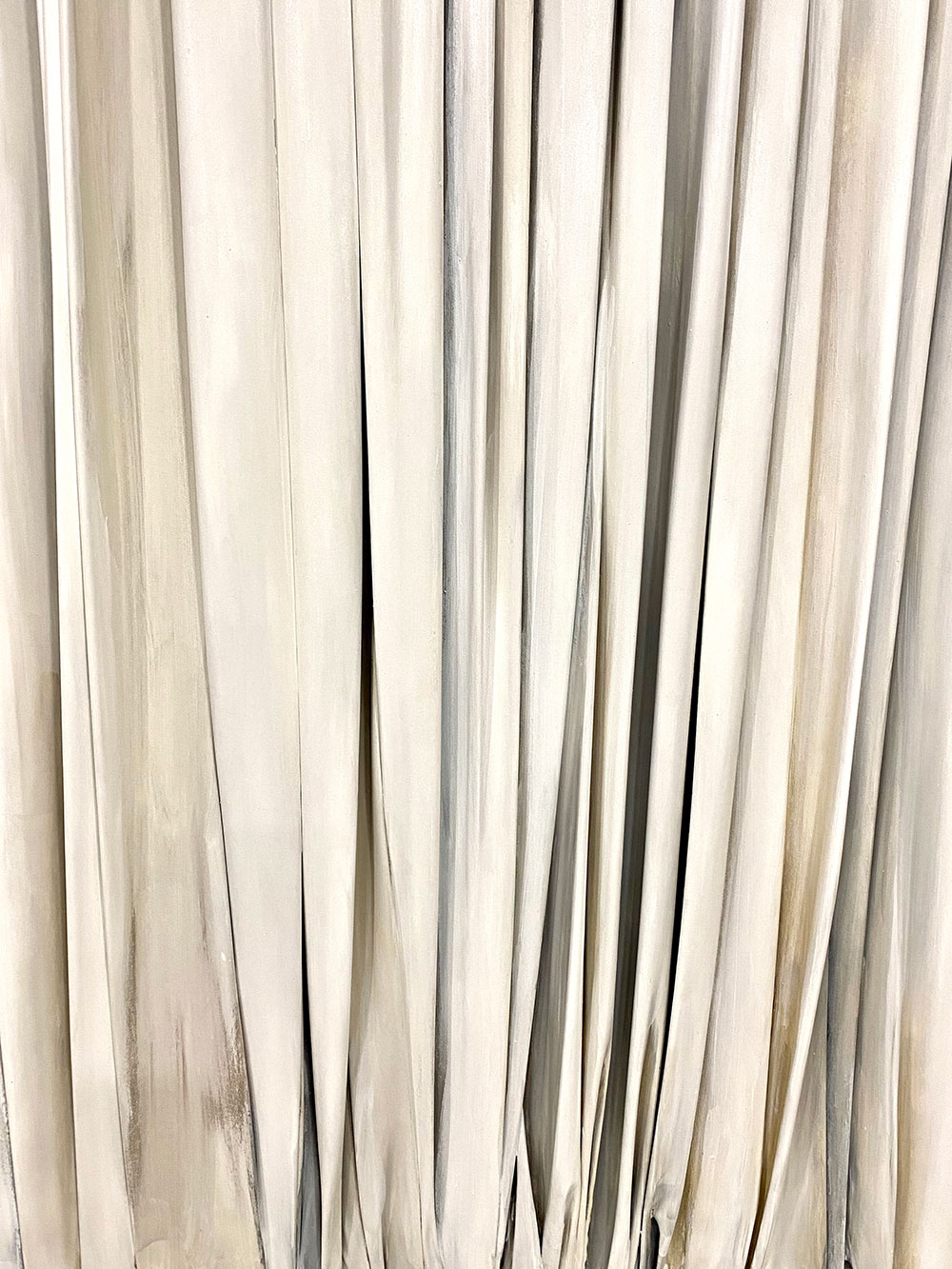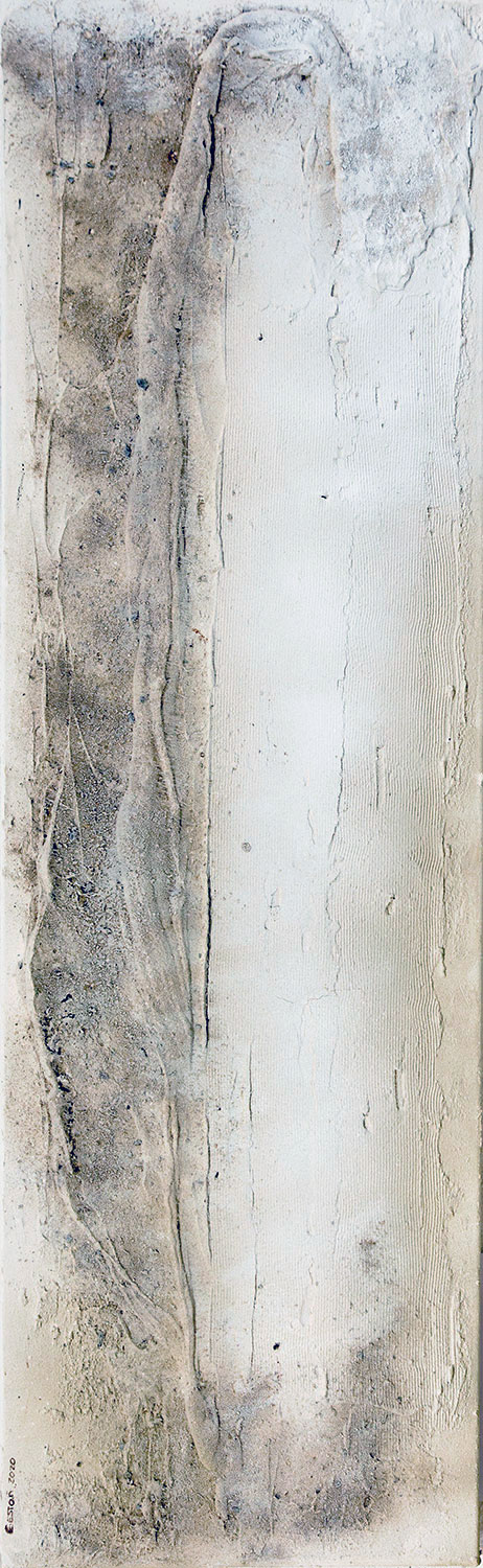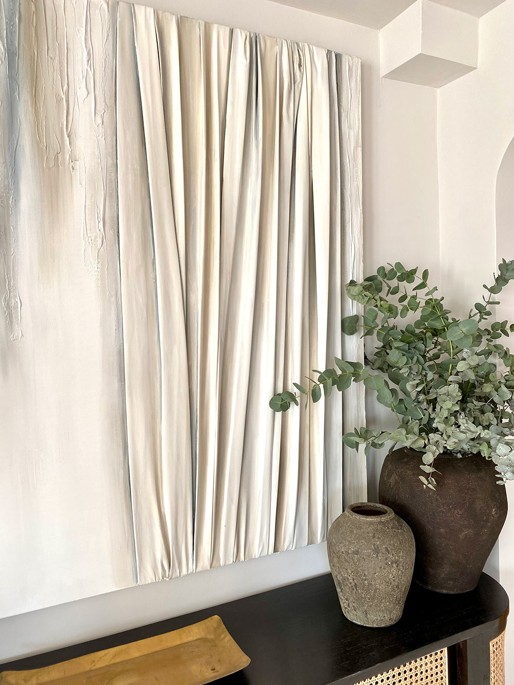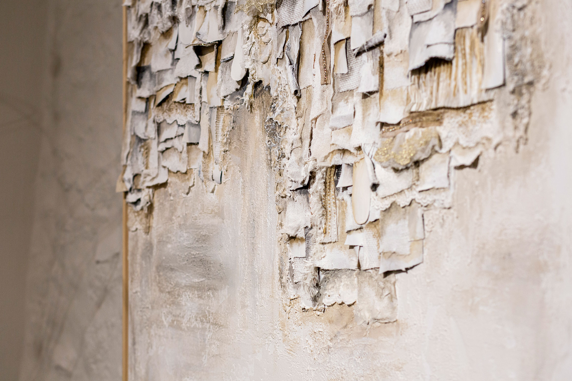 De naturaleza arquitectónica, tejido esculpido sobre tabla o lienzo, pliegues, volúmenes, profundidad, luces y sombras, recrean, arcos, capiteles, columnas y piedra.