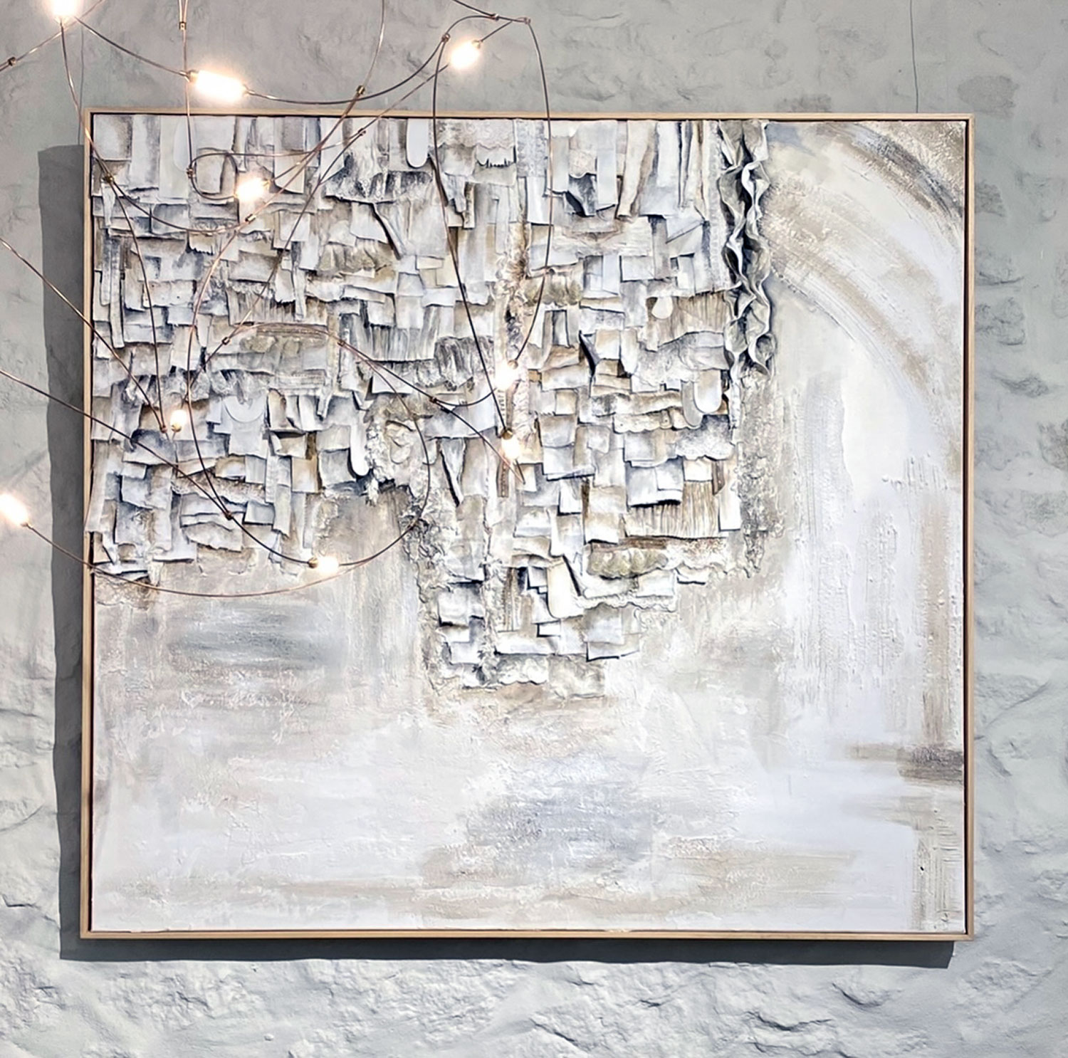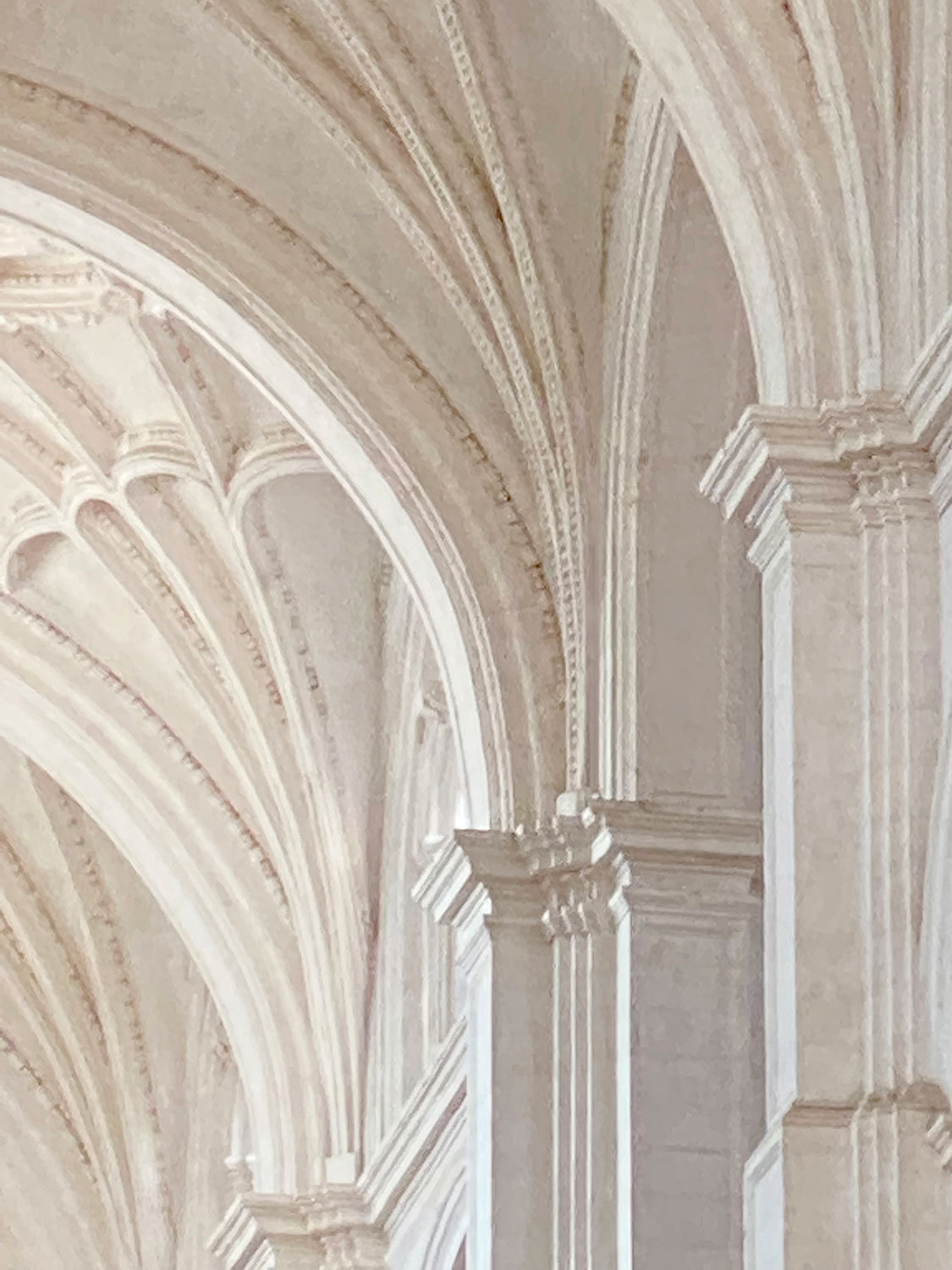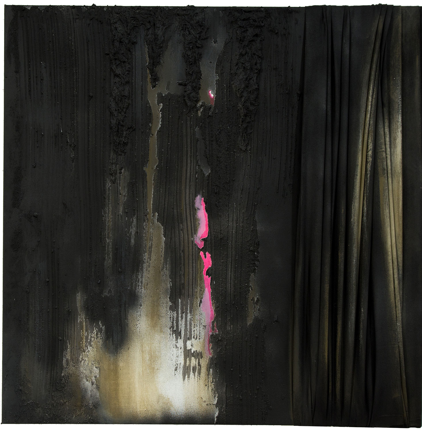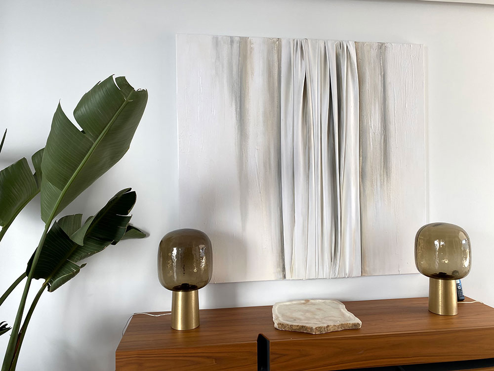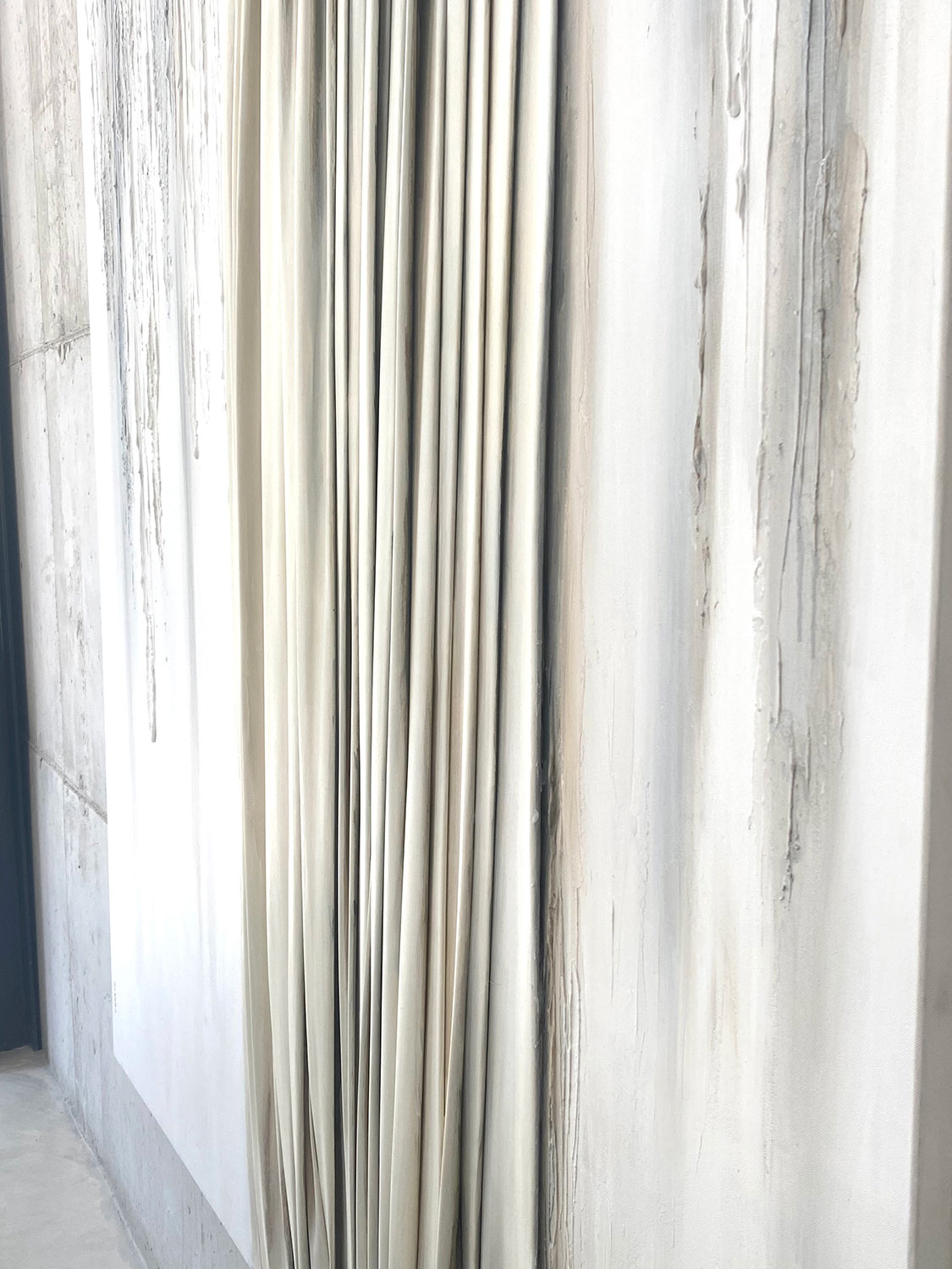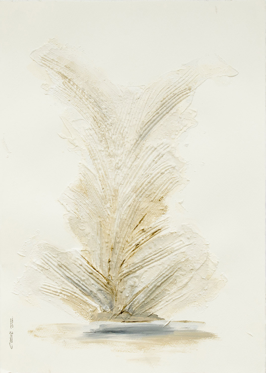 De naturaleza arquitectónica, tejido esculpido sobre tabla o lienzo, pliegues, volúmenes, profundidad, luces y sombras, recrean, arcos, capiteles, columnas y piedra.