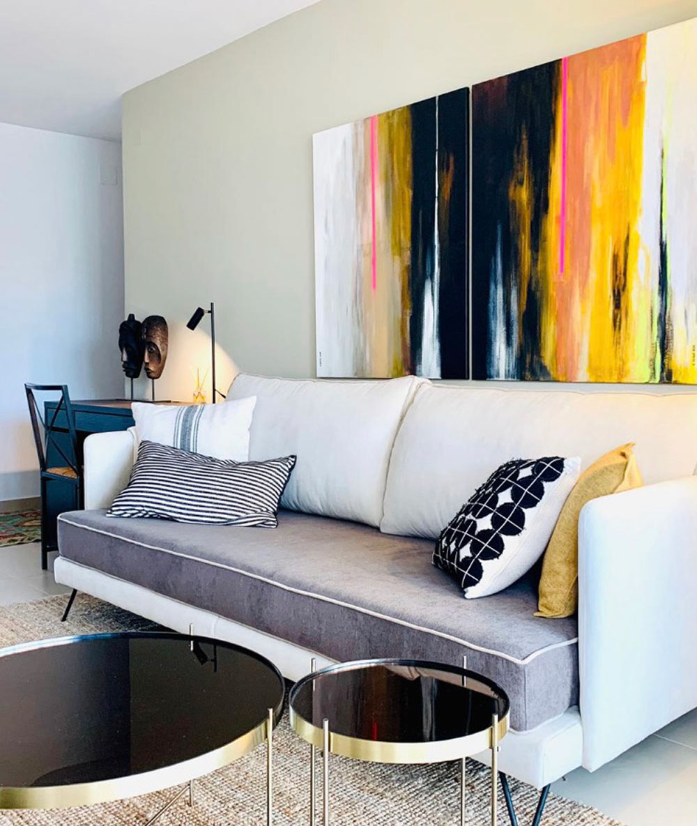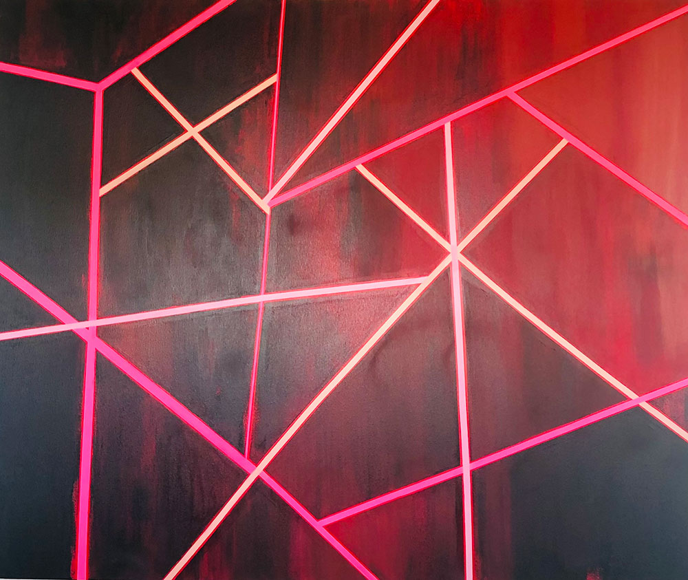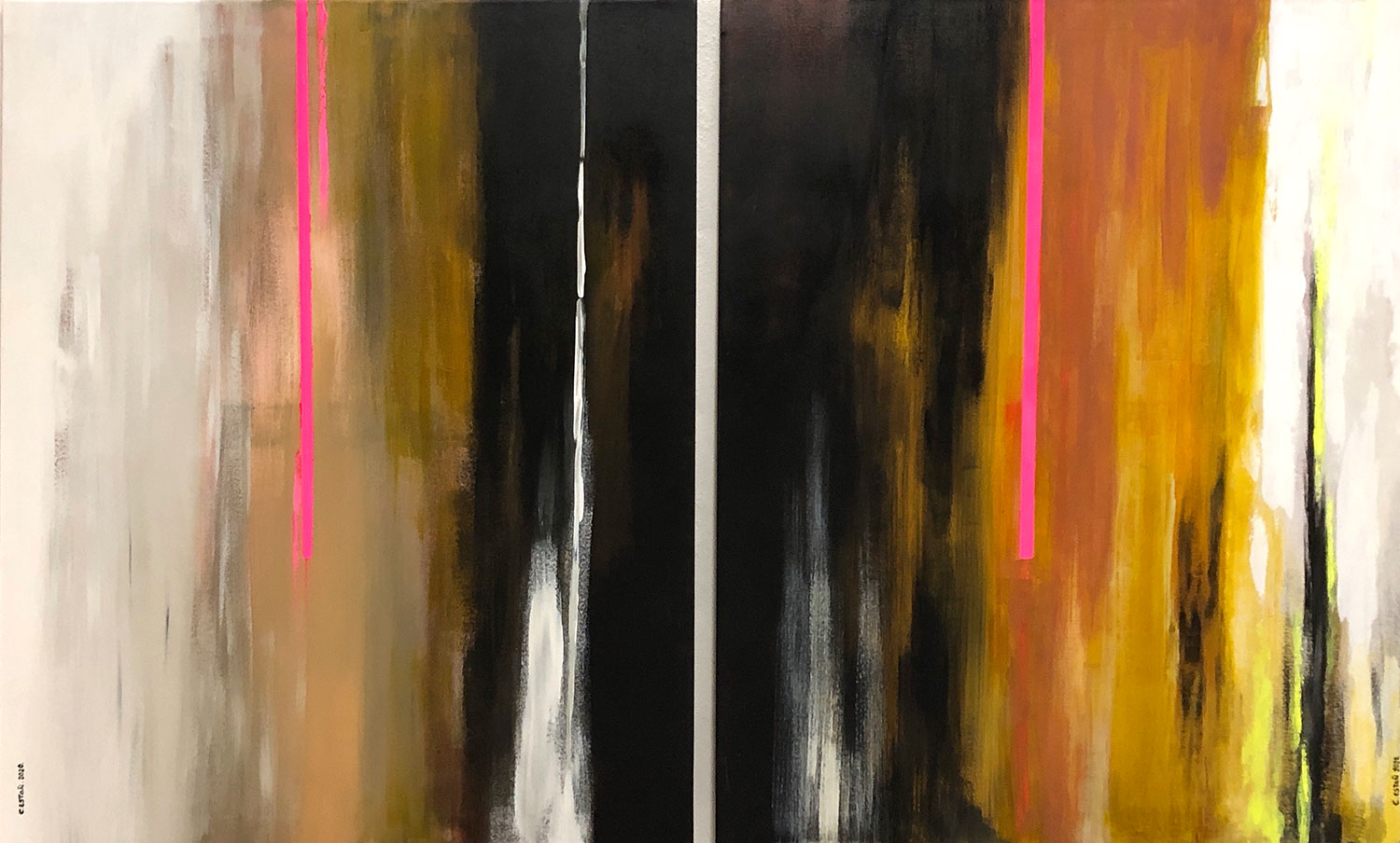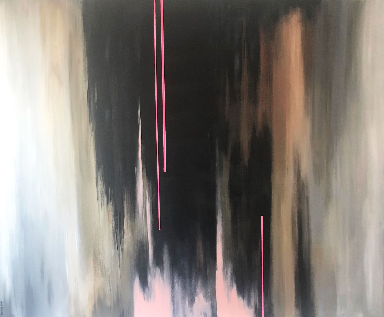 Trazo abstracto e indefinido con colores neutros, forman una base sobre la que destacan colores extremos o flúor con trazos geométricos muy marcados.